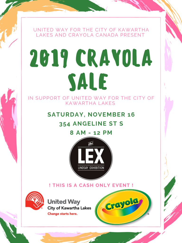 United Way for the City of Kawartha Lakes is excited to announce the date of the 2019 Crayola Sale. Shoppers will still be able to enjoy all of the same deals as previous years, but this year, the date has changed! Please take note and join us on Saturday November 16th from 8am-12pm at the Lindsay Exhibition Fairgrounds. There is no fee for entry but it is important to remember that this is a CASH ONLY SALE.
